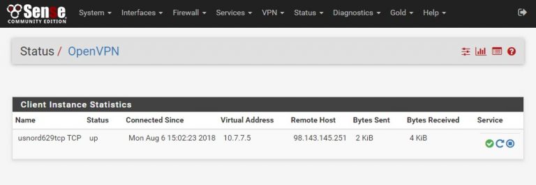At this point, click Save and save this config. When you do pfSense will automatically try to connect – go to Status – OpenVPN and look at the Client Instances Statistics – you should see a new line item with “Status = up” and bytes sent and received. You won’t be able to proceed until this connection shows “up”.