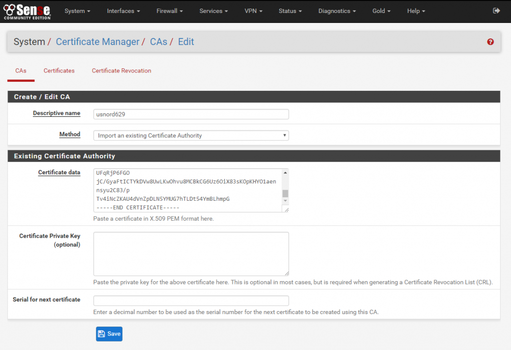 In pfSense/OpenSense, go to System -> Cert. Manager -> CA’s section.