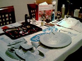 I got the money to the seller of the voyager kit post-auction - he's sending it from Canada, it's due to arrive Friday or Monday. I went to the local Radioshack.Com store after work and examined the LED's they had available. They have a 'white' LED, but the output is much more blue. If you look at it, you could get away with calling it white, but if you shine it on something white, it's definitely blue. I'm thinking to get a true white output I'll need to use miniature lamps. I'm not inclined to use florescent lamps because they have a refresh rate - you can tell it's florescent (this is why they're a bad idea in shops, because with machines like a lathe it's possible for the rotation frequency to match the light's flashing frequency and look like it's not moving). I'm definitely leaning towards using a slightly undervolted power supply and a capacitor to absorb any surges, so I can have nice white window lights. I bought some thin solid core wire, and some shrink tubing. The instructions say to keep the fibre strands together with scotch tape, but that seems like a long term disaster. I intend to bundle them into shrink tubing. I also examined different color mini LED's, because I don't think the kit accommodates for running lights at all (port / starboard, white light over designation, etc). Went to the hobby store and got the paints I had read about on the 'Net. Found a great site that demonstrated a great painting method (http://thomasmodels.com/voybu.html) and the recommended colors to use (http://www.starshipmodeler.com/trek/voycolor.htm). Found that the colors they referenced are in enamels, and not acrylics. Discovered that acrylics are watercolors and enamels are oils (I know that's considered basic, but remember that's what I'm learning.. :) ). In general I would lean towards painting anything with oil-based paint, but what cinched it is the fact that everyone who references the colors (including the creator of the prototype Voyager) references the enamel color scheme, so that's good enough for me - I'm not up to winging color equivalences, and I don't mind using thinners. The fellow at the hobby store pointed out that a base coat should be applied extremely thin - the purpose is simply to give your real paint something to hold on to, doesn't need to be anything fancy. I also learned from the ModelMaster's book that the parts should be perfectly clean prior to assembly and especially painting, and that you should wear latex gloves while handling to ensure your finger oils don't get on the pieces as it causes imperfections in the paint job. Came home and started putting together the saucer section of the Enterprise-D. I found that if you use a drop of ModelMaster's "Liquid Cement for Plastic Models" to anchor a totally loose piece, you'll have time to fidget with it and make it perfect, and it will allow you to use less holding pressure while you apply the real adhesive ("Tenax7R Plastic Welder", as recommended by the fellow at the hobby store - melts the plastic and fuses the pieces together). I learned that capillarity is something you totally want to encourage when working with this stuff - a half drop goes a very long way. Also, the plastic stays soft even after the bond is complete, so if you need to do further filing for whatever reason you need to wait. Speaking of filing, very small files are a must. I played with the microdrill, and discovered that the bit gets hot enough to melt the plastic very, very quickly - you can't just start drillin' away as 1) melted plastic on the tiny bit is very hard to clean off without bending the bit, and 2) the melted plastic makes the hole bigger than it should be. Also learned that the pieces supplied in the model don't fit exactly where they should (obviously, now), but this forces you to make one of three critical decisions in part placement - change the part and use it, place it and make up for it with putty, or don't use that part and adapt the model accordingly. |